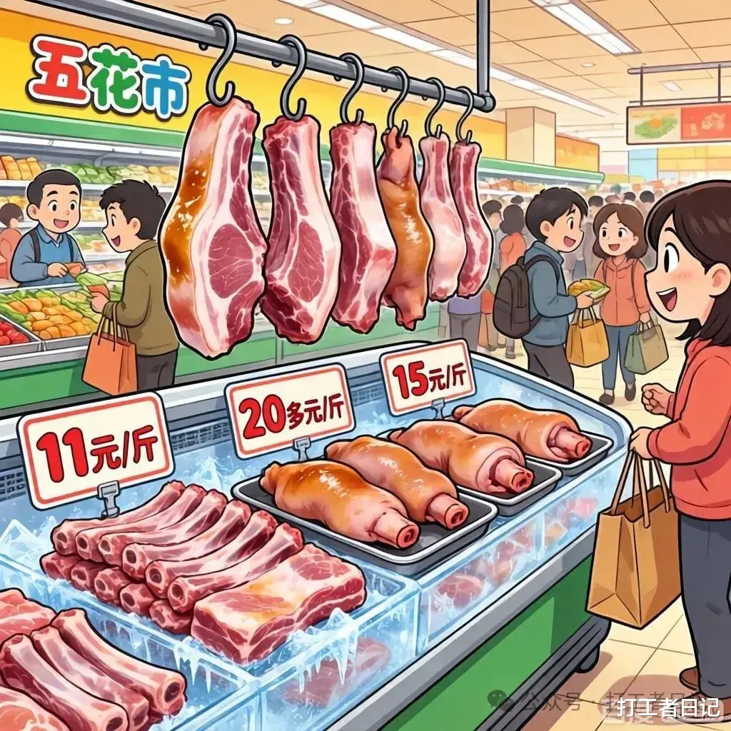 结果去超市一看,五花肉还是11块一斤,排骨照样是20多一斤,猪蹄子也是15块一斤,什么变化都没有啊!