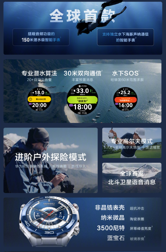 若收礼人是潜水爱好者、登山向导或常年野外作业的专业人士,华为WATCH Ultimate 2非凡探索才是真正的“生命线”。它不仅是智能手表,更是应急通信设备,全球首款支持水下声呐通信(“海豚通信”)的手表,水下30米内可互发消息,60米内可触发SOS求救。