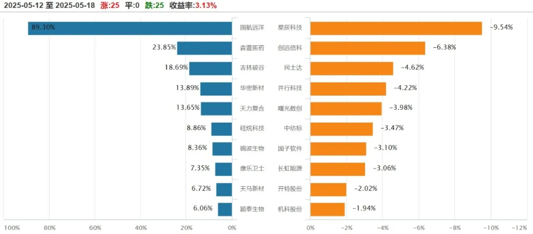 上周(5月12日-5月18日),北证50指数周涨3.13%至1422.43点。北证50成分股中,25只上涨,0只平盘,25只下跌。
