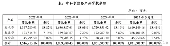具体来看,2022年度-2024年度以及2025年一季度,中和农信放款金额分别为227亿元、276亿元、294亿元和59亿元;2022-2024年末以及2025年3月末贷款余额分别为152亿元、191亿元、196亿元和183亿元。