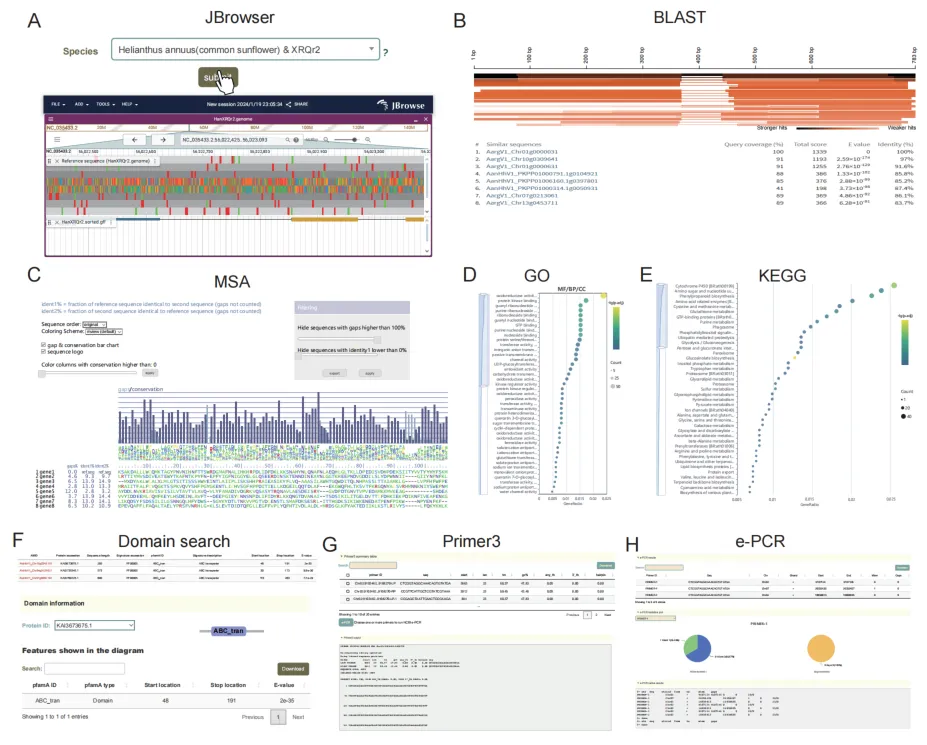 此外,为了提高用户的便利性和可访问性,将9个生物信息学工具集成到AMIR的tools门户中。这些工具包括一系列功能,包括JBrowser, BLAST, Multialignment viewer, Sequence fetch, GO/KEGGenrichment,Primer3, e-PCR和Domain search。值得注意的是,“JBrowser”工具整合了68个菊科基因组和GFF3注释,使用户能够直观地探索特定区域的基因组序列和基因信息。使用BLAST工具,用户可以输入查询核苷酸或蛋白质序列,用于物种内或物种间比较,方便功能分析。“Multi Alignment Viewer”允许用户执行多个序列比对,以识别序列之间的保守区域。此外,“Sequence fetch”工具使用户能够检索参考序列,包括基因组序列、编码序列(CDS)和蛋白质序列,用于定制分析。对于基因集的功能预测,“GO/KEGGenrichment”工具提供了可下载结果的富集分析功能和富集途径气泡图的可视化。“Primer3”和“e-PCR”等模块帮助用户快速选择基因或核苷酸序列的最佳引物对,以方便下游实验。最后,“Domain search”工具有助于识别蛋白质结构域,提供对其功能作用的见解。总之,AMIR工具的开发支持了菊科物种的功能基因发现、比较基因组研究和分子实验。