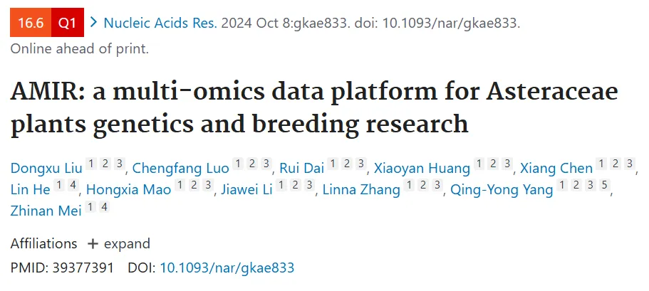 Liu D, Luo C, Dai R, Huang X, Chen X, He L, Mao H, Li J, Zhang L, Yang QY, Mei Z. AMIR: a multi-omics data platform for Asteraceae plants genetics and breeding research. Nucleic Acids Res. 2024 Oct 8:gkae833. doi: 10.1093/nar/gkae833. Epub ahead of print. PMID: 39377391.