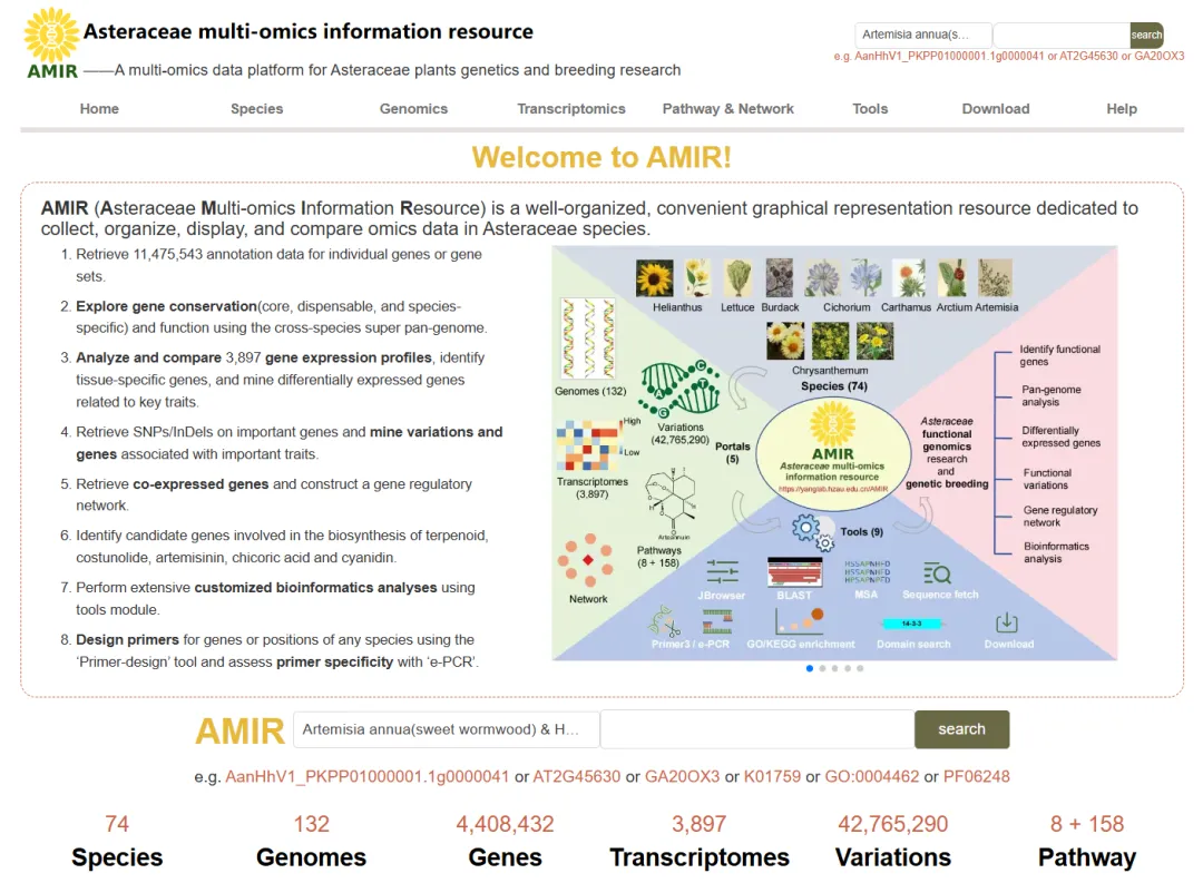 AMIR (https://yanglab.hzau.edu.cn/AMIR/),致力于开发一个全面且用户友好的多组学数据平台,该数据库集成了来自74 个物种的多样化组学数据,包括 132 个基因组、从7个不同角度注释的4,408,432 个基因、3897 个涵盖131 个器官、组织和刺激物的转录组样本、42,765,290 个独特的变异和 15,662 个代谢物基因。基于以上数据,AMIR构建了8个专注于基因的组学模块,包括Species, Genomes, Transcriptomes, Variome, Pathways&Networks, Tools, Downloads和Help。