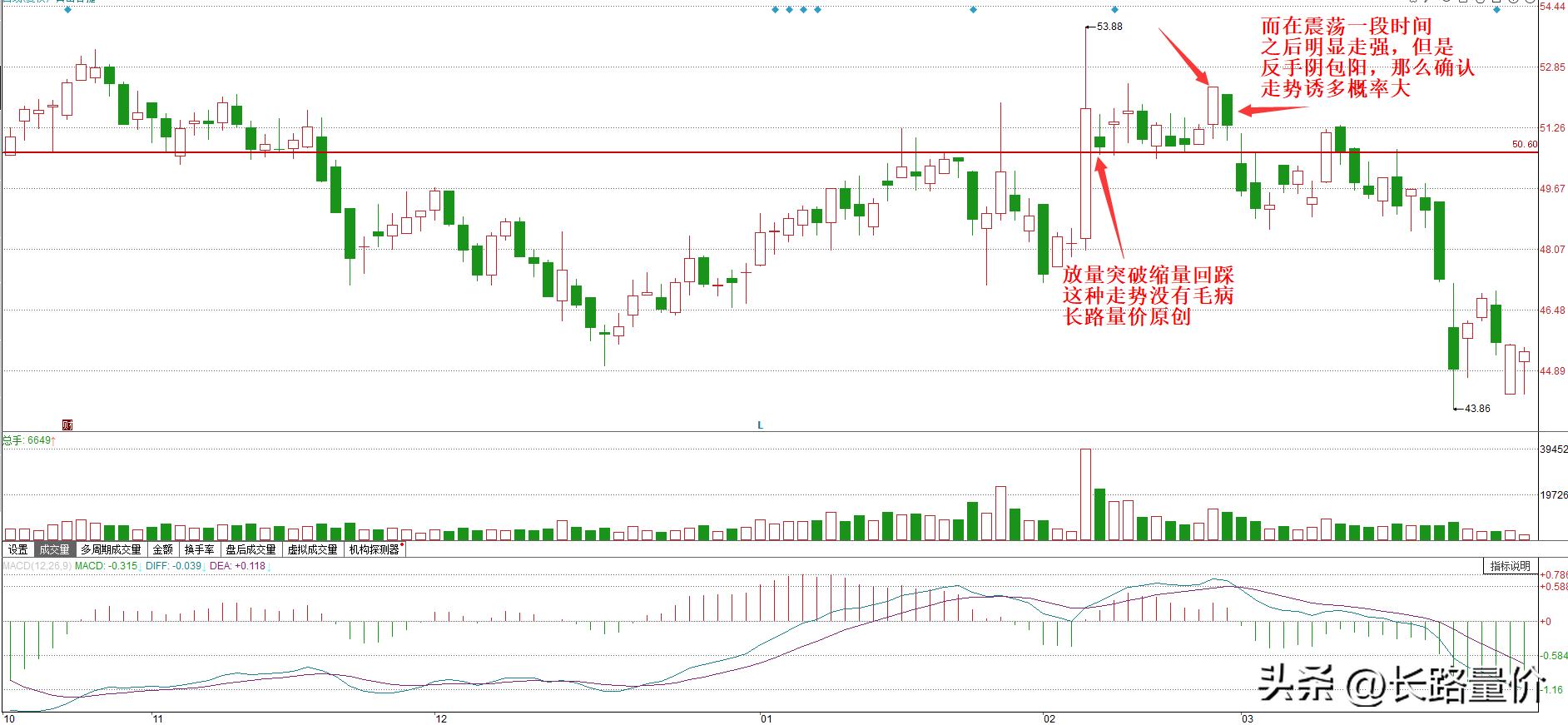 这就说明前期的走势就是诱多,因为这种震荡正常走势,或者说绝大多数的走势,后面都是应该是震荡上涨了,而不能在出现放量阳线逐渐突破的过程中,再次出现放量阴线反包回来,这是比较典型的一种诱多的走势,大家可以多去找个股去验证一下,是不是这样?以上都是本人的浅薄的看法,仅供参考。