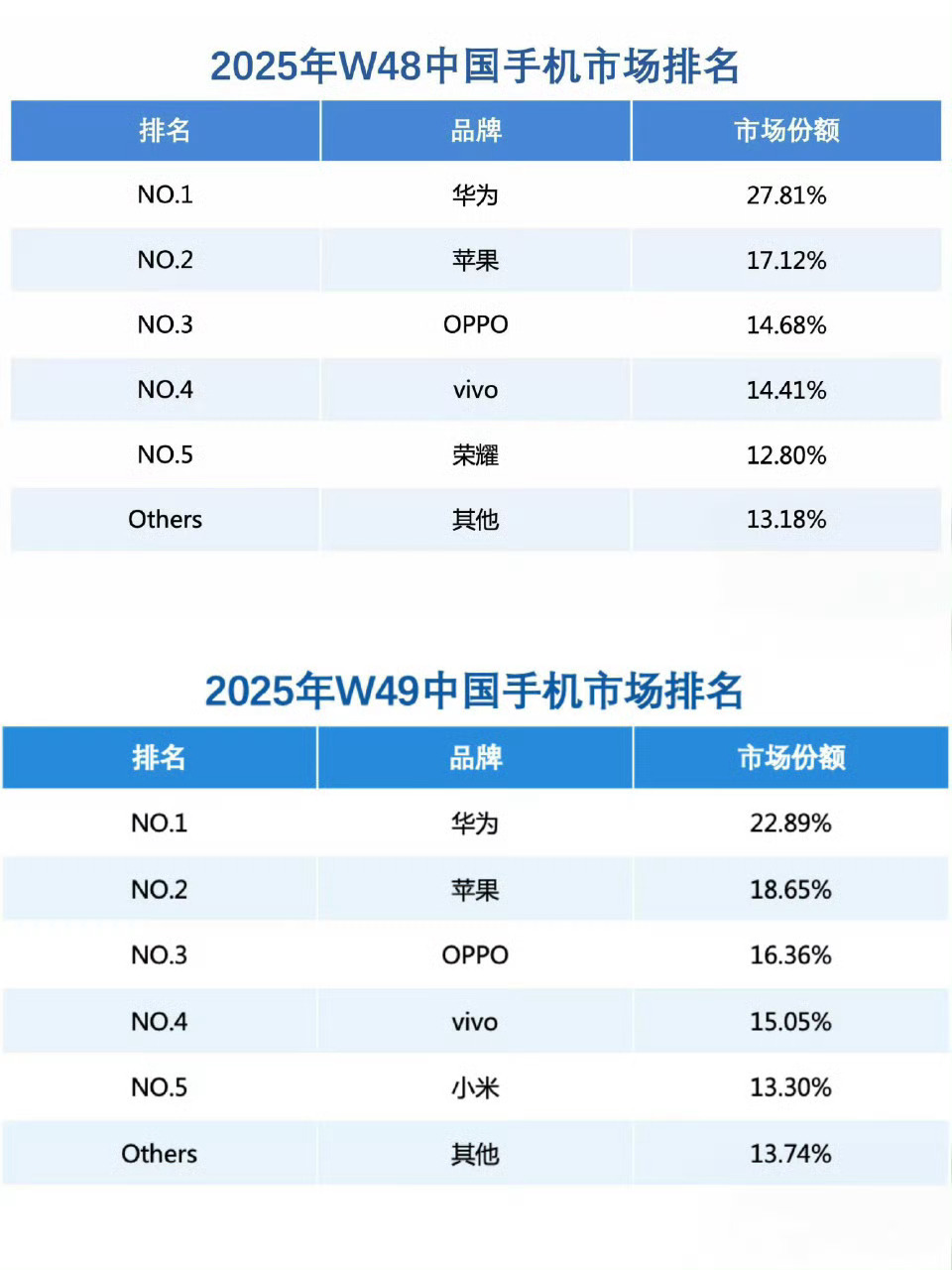 在2025年第49周中国手机市场排名中,华为以22.89%的市场份额位居第一;苹果以18.65%的市场份额位居第二;OPPO以16.36%的市场份额位列第三;vivo和小米分别以15.05%的市场份额和13.30%的市场份额,分列第四、第五。