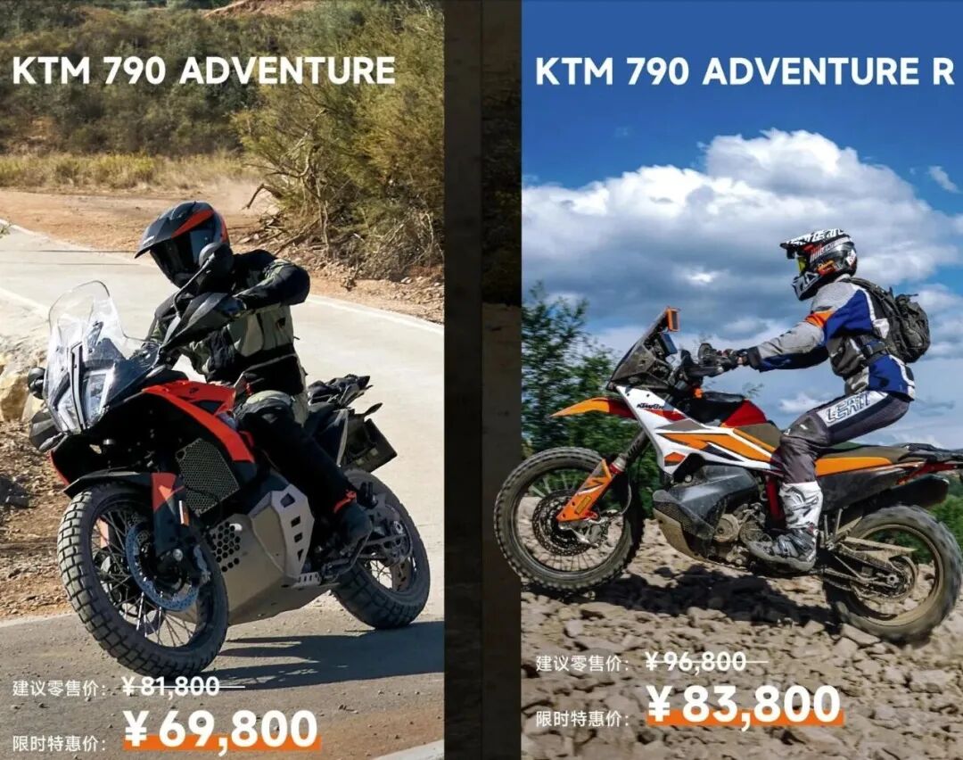 KTM 790 ADV普版原价81800元,限时优惠价69800元,直降1.2万;KTM 790 ADV R版原价96800元,限时优惠价83800元,直降1.4万。
