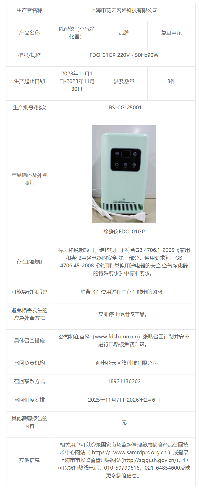 近日,上海申花云网络科技有限公司召回8件复旦申花牌除醛仪(空气净化器),规格型号为FDO-01GP 220V~50Hz90W,生产批次为LBS-CG-25001。召回产品标志和说明项目、结构项目不符合标准要求,消费者在使用过程中存在触电的风险。