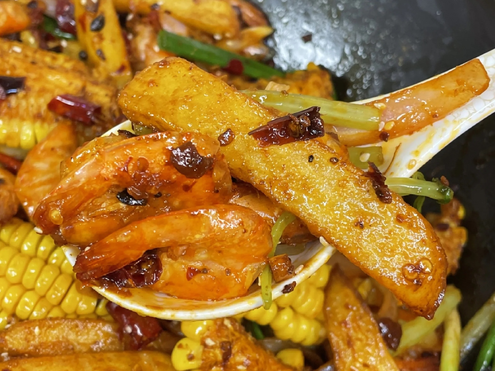 油炸是赋予食材灵魂的第一步。六成热的油温是黄金标准,虾入锅中,只需一分半到两分钟,便通体金黄、外壳酥脆,捞出备用。接着,将土豆、玉米、莲藕依次放入锅中,炸至熟透边缘微焦,以便在后续翻炒中不易软烂。锅中留底油,此刻便进入了风味的核心锻造阶段:干辣椒、花椒、姜、蒜等香料在热油中煸炒,瞬间爆发出令人食指大动的辛香。随后,一勺醇厚的豆瓣酱与一块固态火锅底料相继入锅,在文火慢炒中融化交融,炒出那层标志性、红亮诱人的红油。