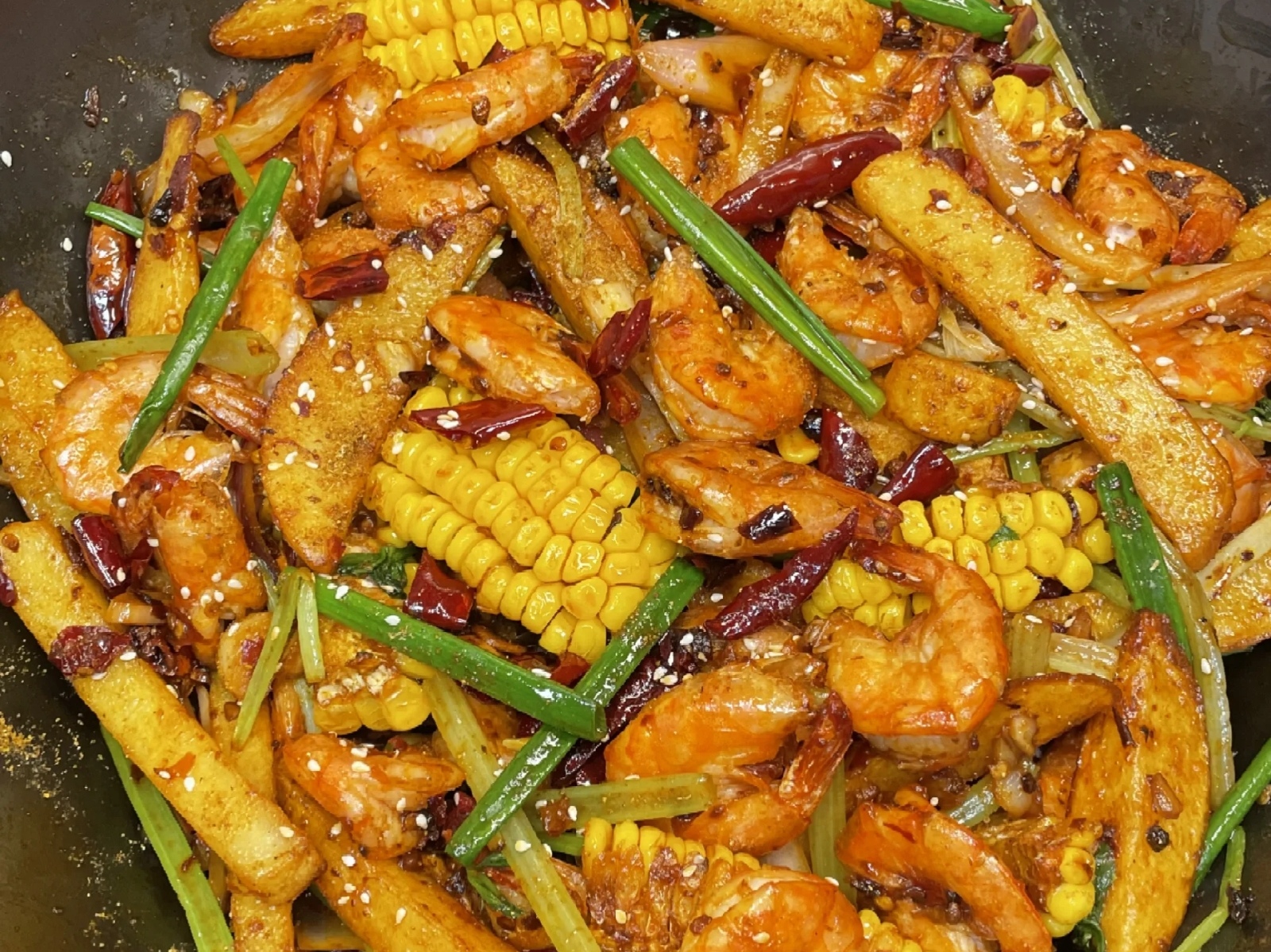 当底料香气达到顶峰,便是所有主角华丽归位的时刻。炸好的大虾、土豆、玉米、莲藕,以及清新的洋葱段、芹菜段一同倾入锅中,在红油的包裹下快速翻炒,让每一寸食材都均匀沾染上浓烈的麻辣酱汁。调味则在这一刻画龙点睛:可加入两匙生抽、半匙砂糖与两匙香醋,还有少许孜然粉的加入,更平添了一缕烧烤般的风情。最后撒上一把翠绿葱段与熟芝麻,在热气中稍加翻拌,一锅色泽红亮、香气扑鼻、虾酥菜嫩的麻辣干锅虾便可盛大出锅。
