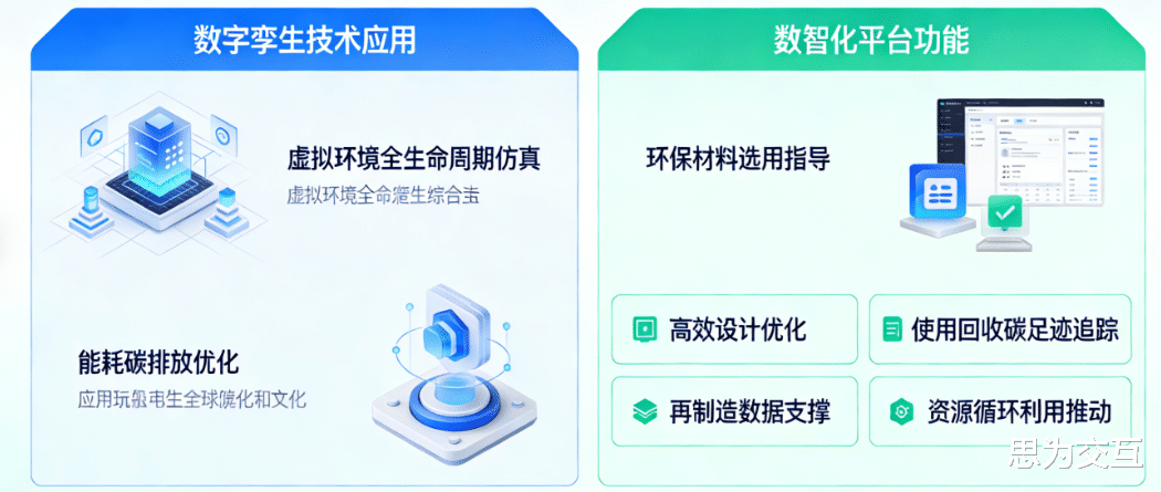 数智化赋能产品从设计源头就融入绿色理念。通过数字孪生技术,可以在虚拟环境中对产品全生命周期的能耗和碳排放进行仿真与优化,指导选用更环保的材料和更高效的设计。同时,数智化平台还能追踪产品在使用、回收阶段的碳足迹,为发展再制造、促进资源循环利用提供数据支撑,推动制造业向循环经济模式转型。