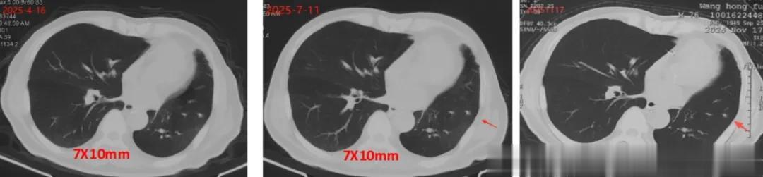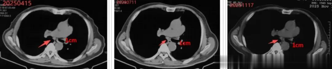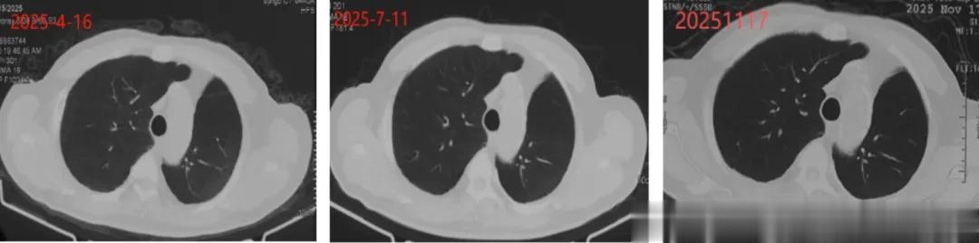 2025年6月,陈先生进入vNKT细胞治疗,方案1疗程/月,在完成5个疗程回输后复查,影像学检查显示肺部结节已经稳定下来,病情控制稳定。