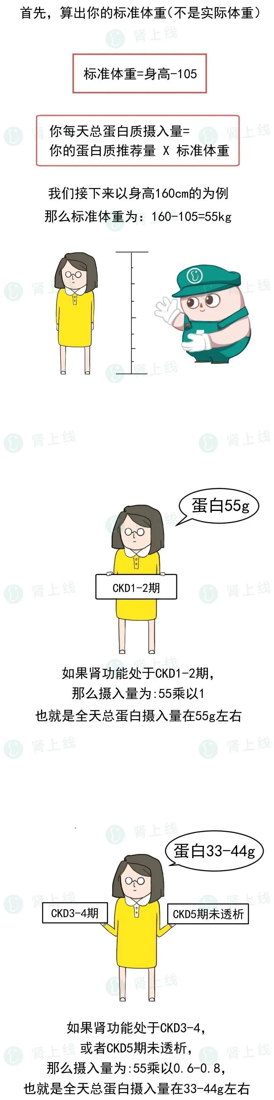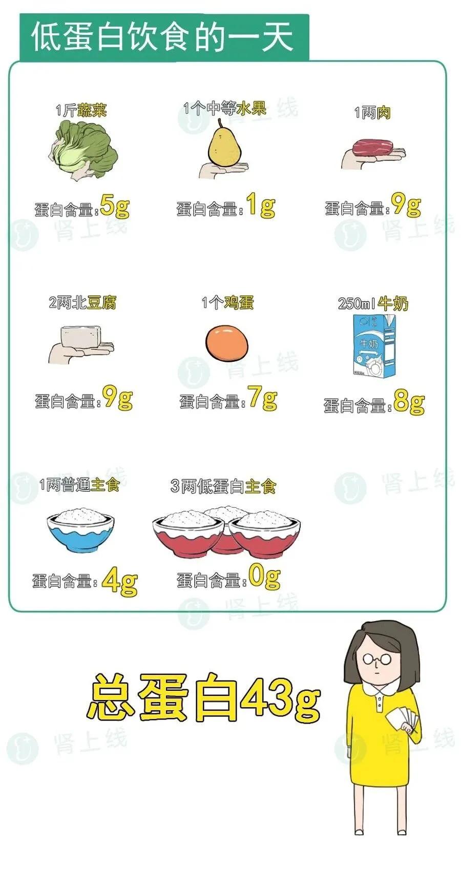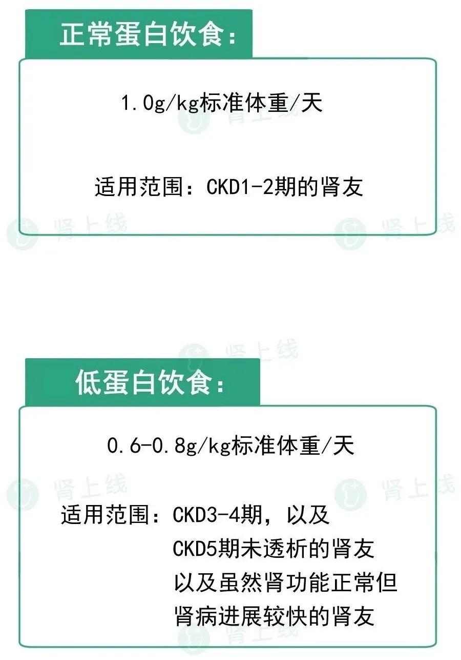 温馨提醒:蛋白质不是越低越好,通常不应低于0.6g/体重kg/天,否则容易出现营养不良,反而增加死亡风险。