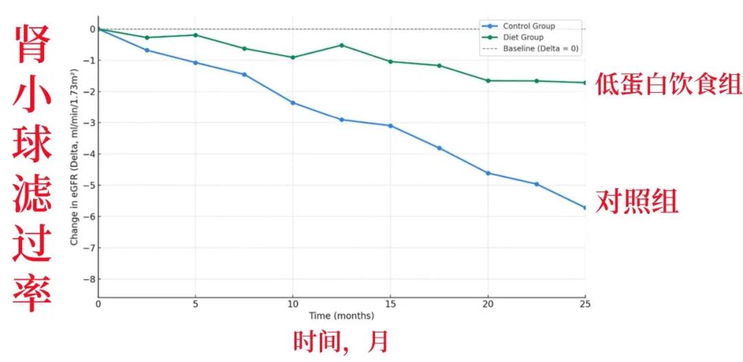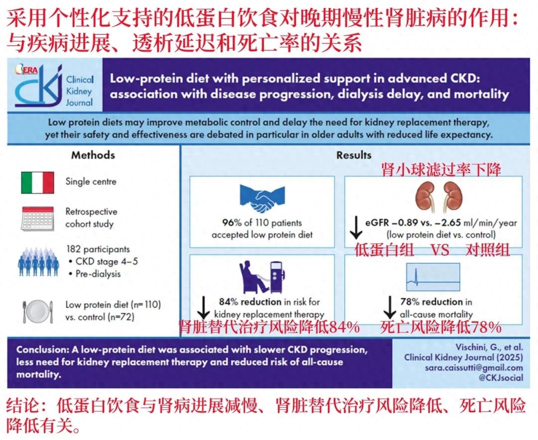 统计分析显示,低蛋白饮食组的透析风险降低84%,死亡风险降低78%。
