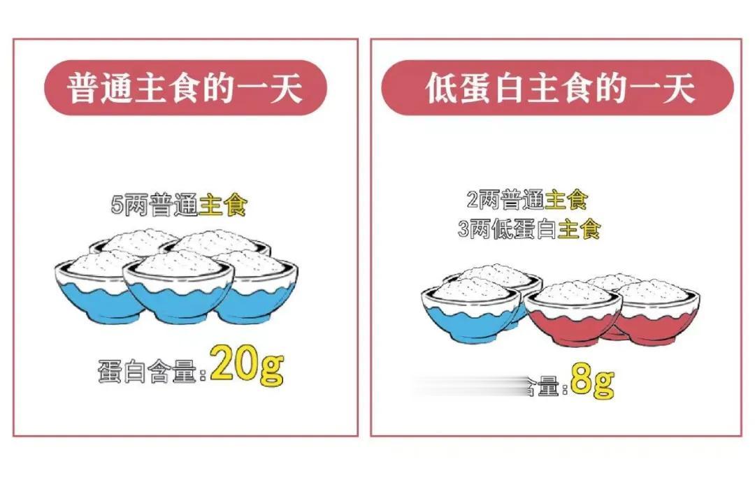 方法:用低蛋白主食,包括如低蛋白米、低蛋白面、麦淀粉、粉丝、藕粉、红薯、山药等,替换一部分普通主食(普通米饭面条等)。