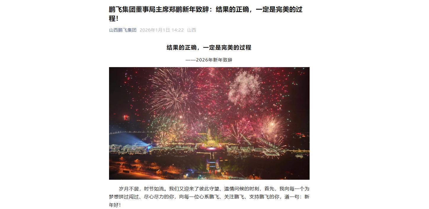 山西鹏飞集团在其官方社交平台发布了郑鹏的新年致辞。(图片来源:界面山西)