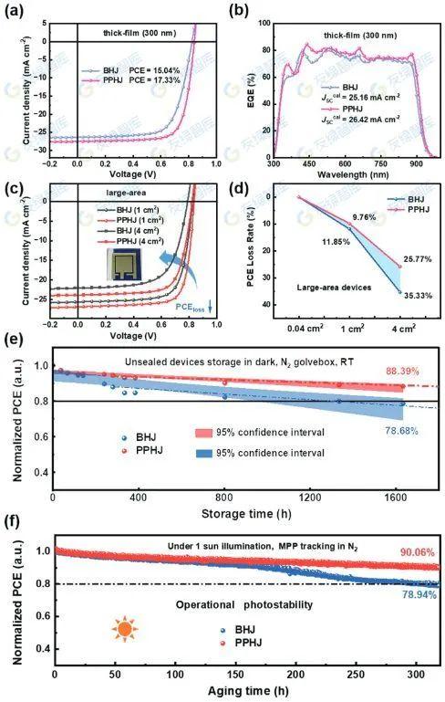 重要的是,PPHJ OSCs还表现出优异的长期储存和工作稳定性,以及热稳定性。长期储存T80稳定性超过1600小时,工作稳定性T80超过300小时。