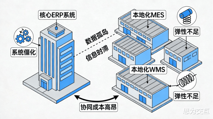 协同成本高昂:跨工厂的订单协同、物料调拨、产能互助主要依赖人工电话、邮件沟通,效率低下且容易出错。一项涉及多工厂的库存调拨方案,在传统架构下需要人工反复核对多个独立系统的数据,协同成本极高。