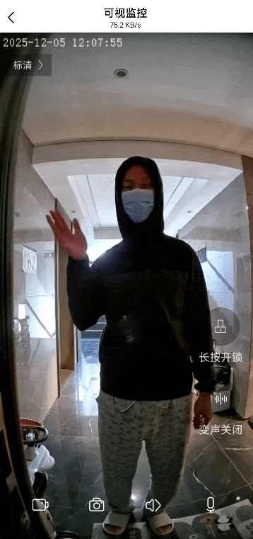 ▲当门口有人按下门铃时,APP会收到推送,点击通话即可 远程视频通话,并且可以变声(对于独居人士更安全),长按开锁键就能给门外人员 远程开锁,极其方便!