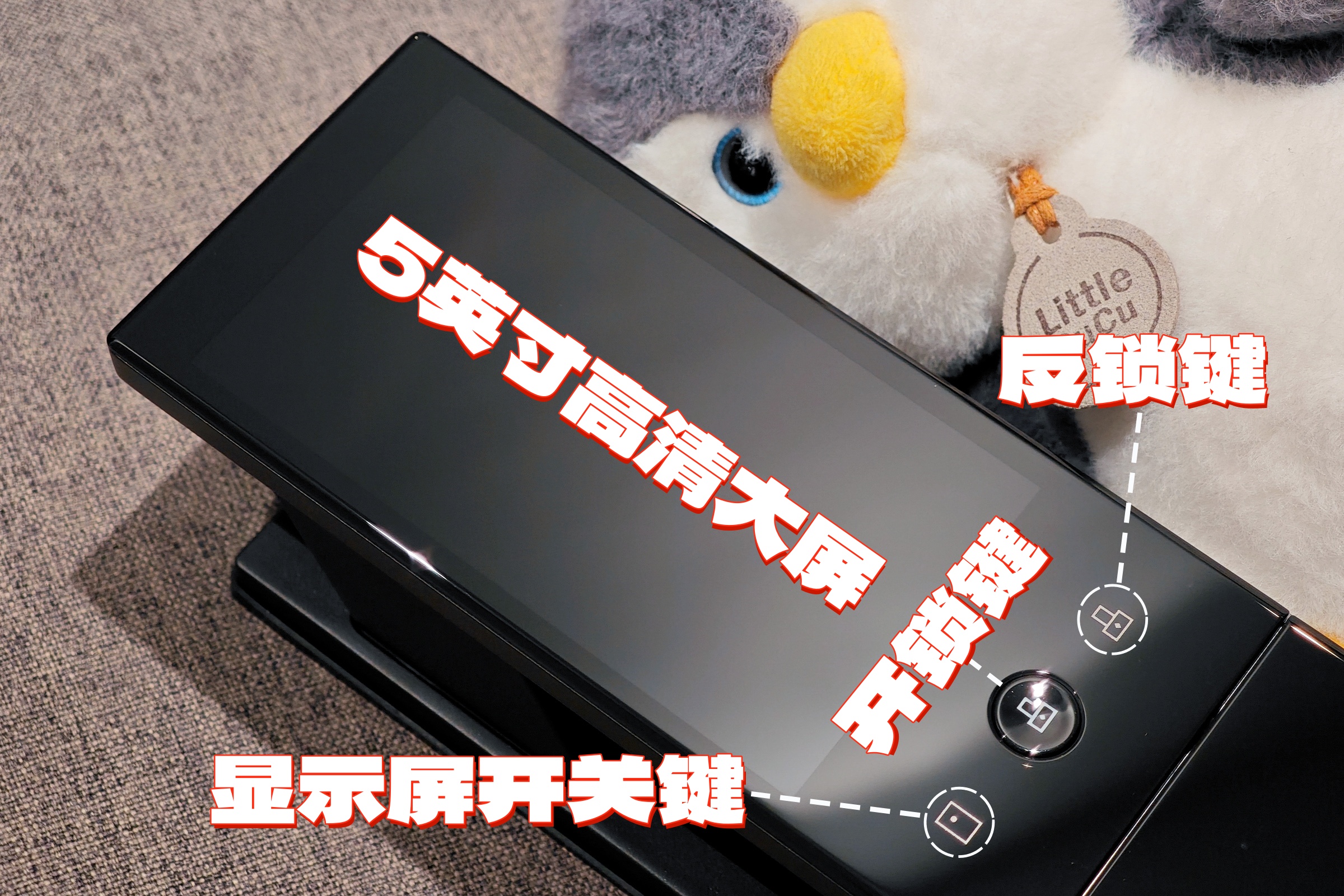 ▲后面板上最引人注目的自然是这块 720P分辨率 的 5英寸高清IPS彩色大屏 了,配合前面板的“眼睛”—— 高清超广角摄像头 ——就组成了远比传统猫眼更好用更安全的电子猫眼系统。只需要按下左侧的 显示屏开关键 ,就能实时查看门外状况。当门外有人逗留或是按门铃时,显示屏也会自动亮起,真心方便。屏幕下方的实体按钮是 开锁键 ,按下即可从内开门。右侧的是 反锁键 ,可控制反锁以及童锁模式。