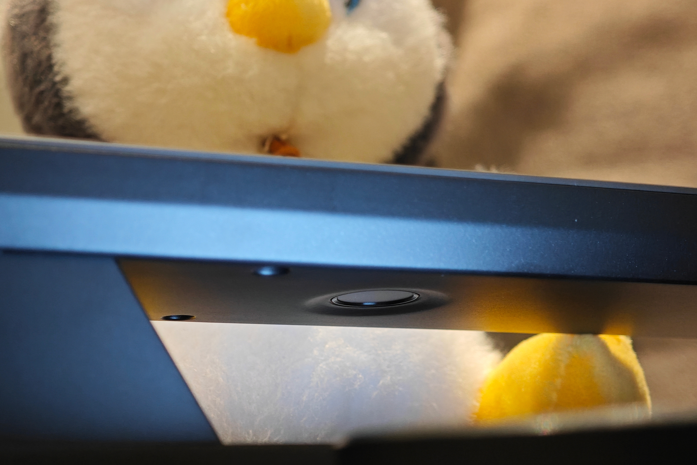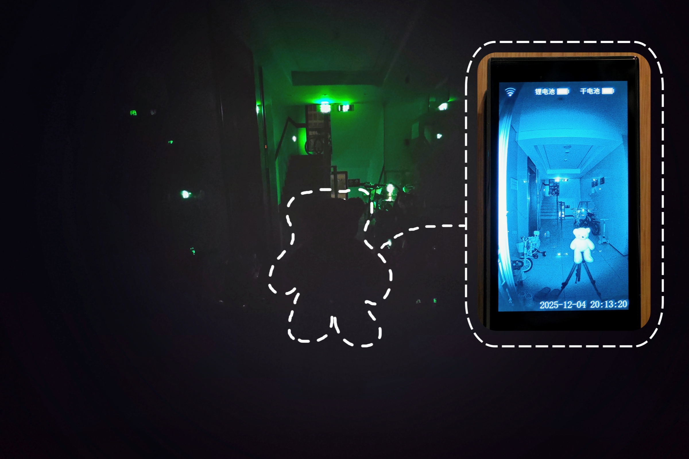 ▲当门外亮度太低,红外夜视补光会自动开启,哪怕外面再黑,也能看得一清二楚。如图中所示,我在楼道变暗的时候拍的照片,画面中央的泰迪熊根本难以分辨。而在门内,按下显示屏开关键后,门外的一切都被 星光级夜视猫眼 看得明明白白,也能够清晰辨别出泰迪熊玩偶。