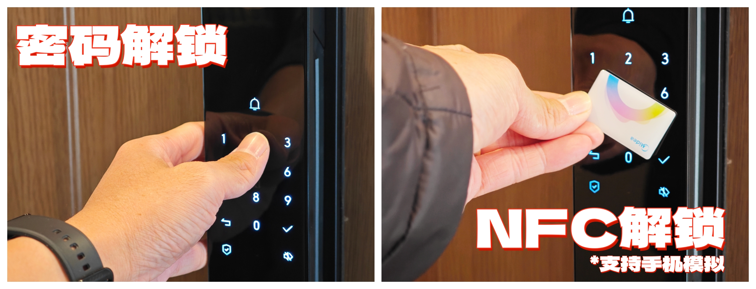 ▲密码支持 虚位密码输入,在正确密码前后输入任意数字都能够开门。NFC解锁则更显优雅,碰一碰就开,还支持 手机NFC模拟门卡,别提有多方便了~
