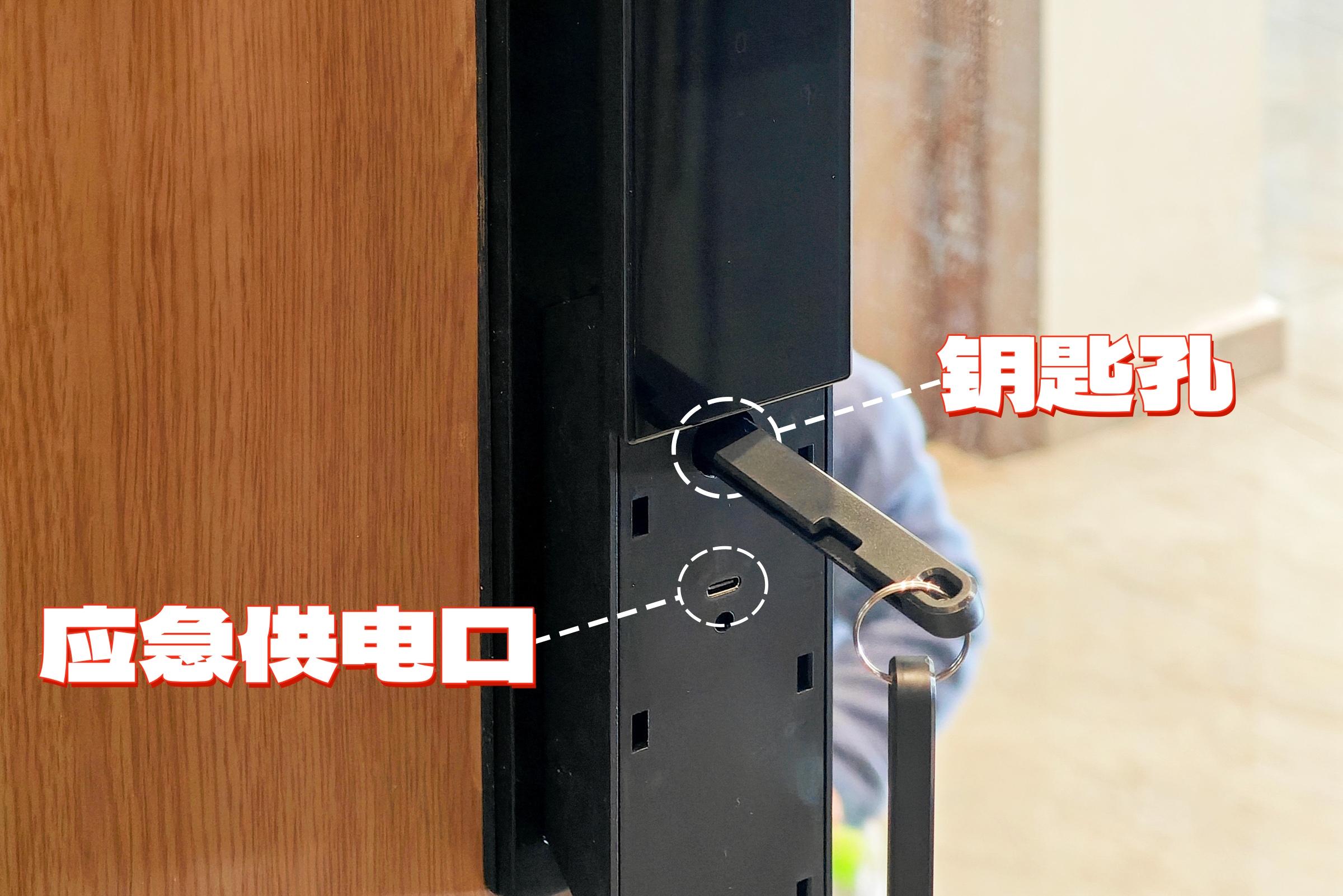 ▲即使遇到极端情况,彻底没了电,前面板银色盖板下还配置了 Type-C应急供电口,用充电宝即可临时供电开门,同时也可以使用机械钥匙打开门锁,丝毫不慌。