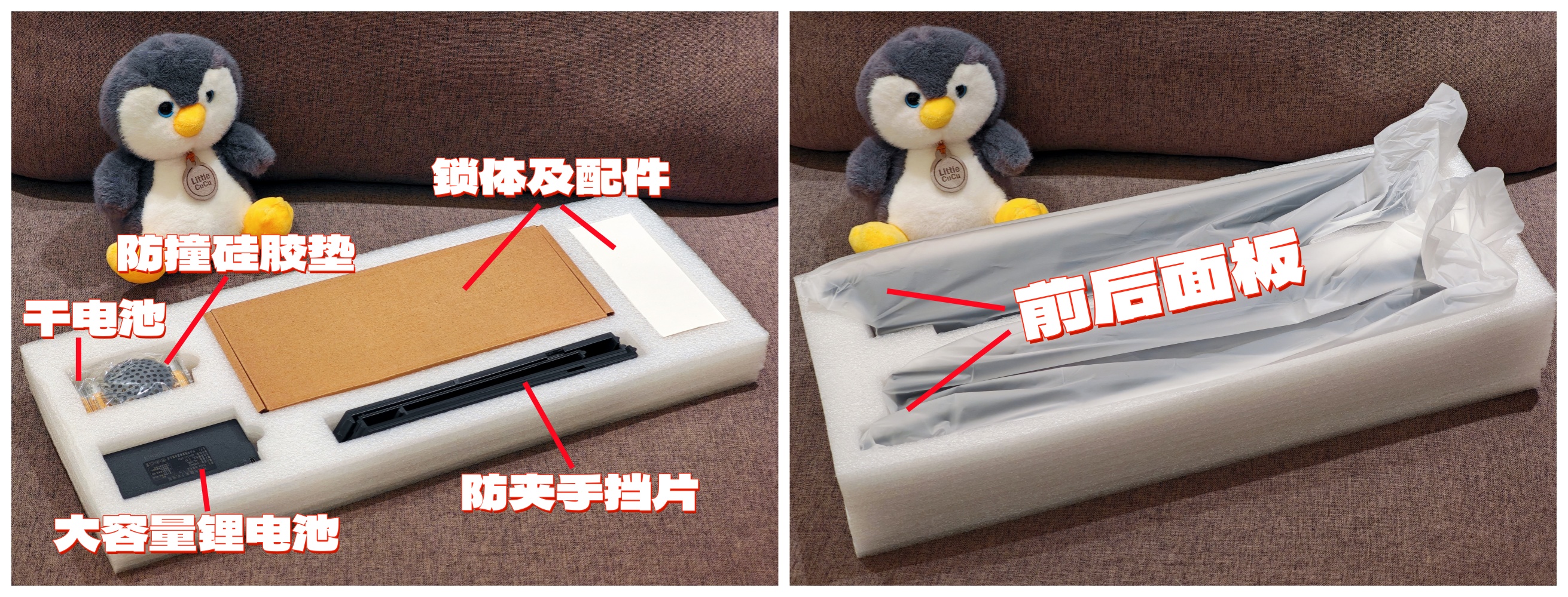 ▲纸箱内容物分为两层,一层包含了锁体及配件、防夹手挡片、锂电池干电池以及赠送的防撞硅胶垫。另一层则是用厚厚的海绵紧紧包裹的前后面板。这样用心的包装,运输过程破损几乎不可能。