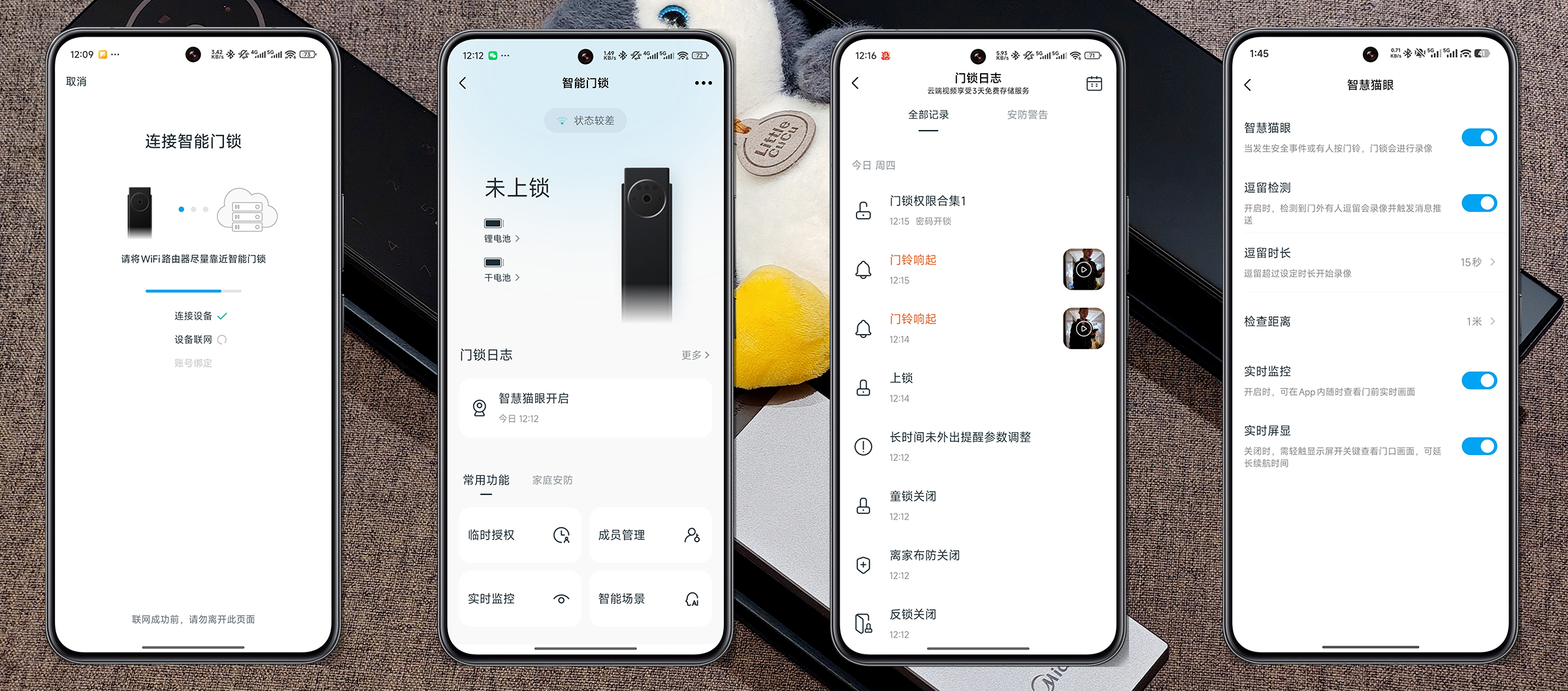 ▲门锁联网很简单,下载安装 美的美居APP ,在APP中扫描门锁电池仓内的二维码,按照提示两步就能完成配网。连接后即可实时查看 门锁状态,点击 门锁日志还能看到各种记录,也可以对电子猫眼各项参数进行深度自定义,非常强大!