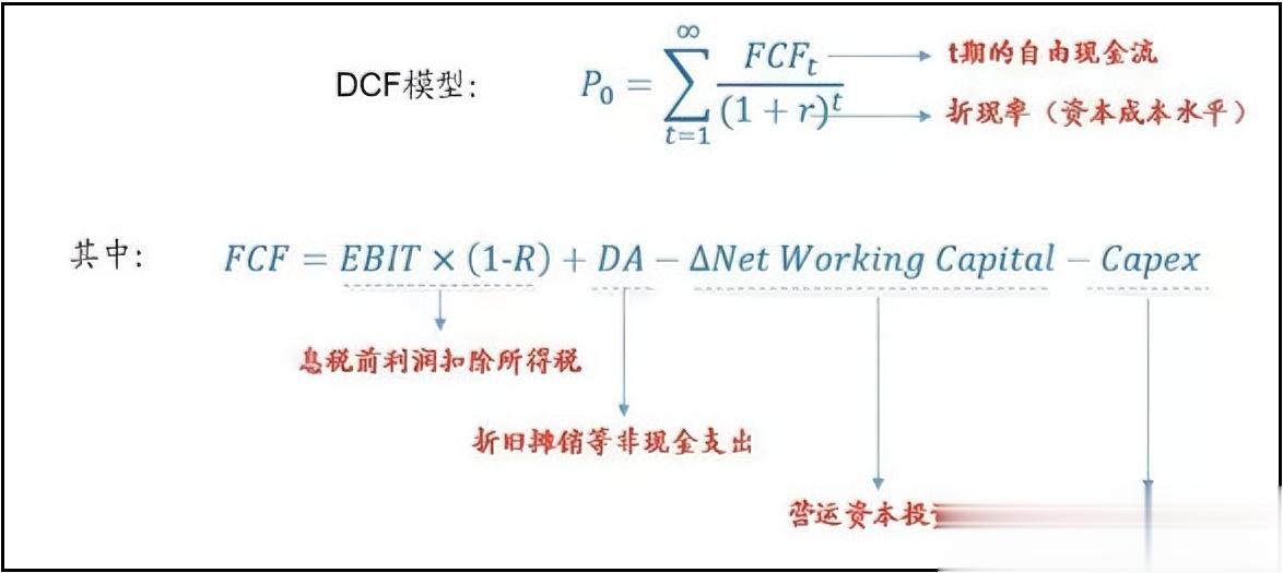 如上图所示,DCF估值模型的分子是未来的“自由现金流”。说白了就是公司运营下来,扣掉日常开支、扩大生产的投入、交税这些必须花的钱之后,真正能留给投资者的净现金。这才是公司赚钱能力的硬指标,手里有实实在在的现金才算数。