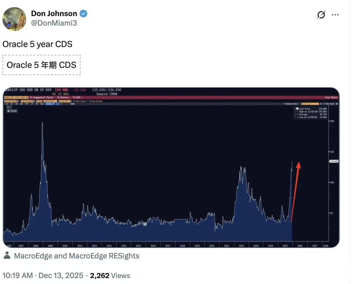 这就导致两个致命影响:一是未来的“自由现金流”可能变多吗?悬。本来要扣的资本开支大幅增加,合作方的收入又不稳定,手里能剩下的净现金自然没了保障,DCF模型里的“分子”根本没法确定会涨。二是风险直接飙升。市场一看这情况,都觉得甲骨文的经营不确定性太高了——从它5年期CDS(可以理解为市场对它违约风险的判断)的走势就能看出来,大家对它的信心在下滑。这时候,“折现率”肯定得往上提,DCF模型里的“分母”实打实涨了。