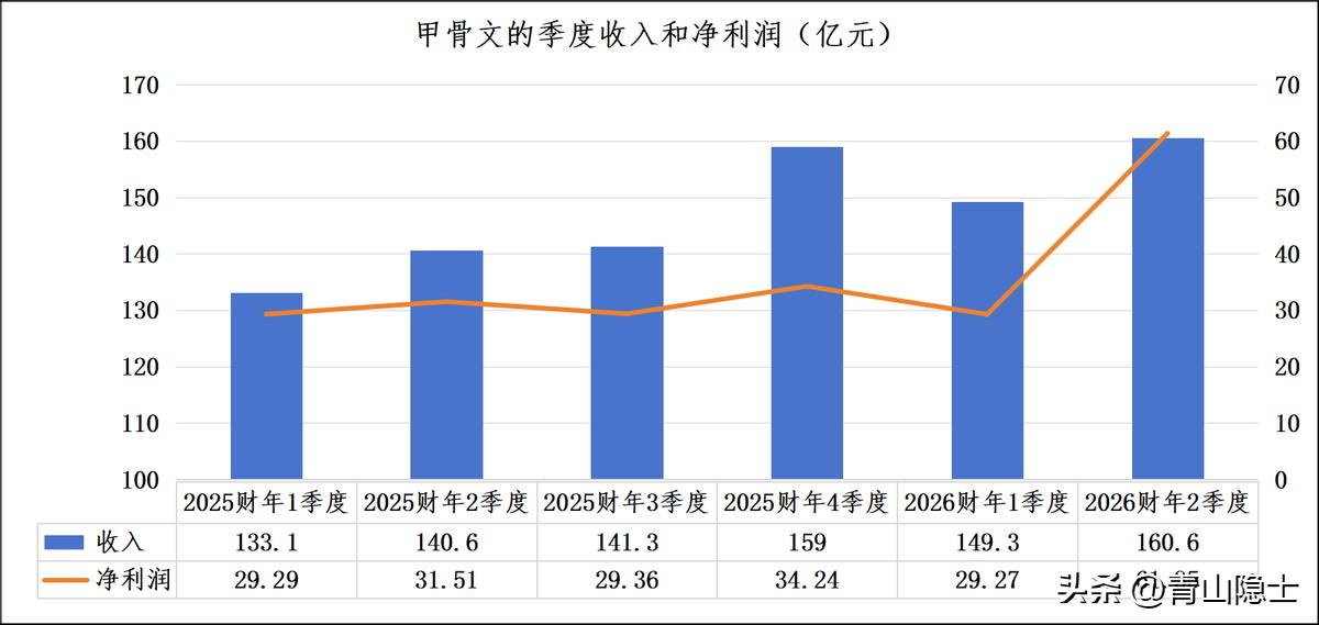 根据甲骨文2026财年2季度(2025年9月-11月)报显示,其季度收入与净利润呈现“收入稳增+利润爆发”的强劲表现。