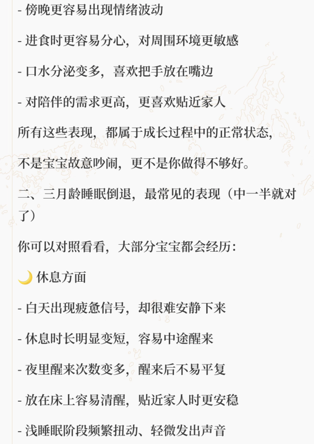 还有一个容易被忽略的点,就是宝宝在睡眠倒退期可能会更黏人。他需要更多的安抚和安全感,这时候别觉得他会养成坏习惯就不敢抱他。适当的回应和拥抱,反而能让他更有安全感,更快度过这个特殊阶段。