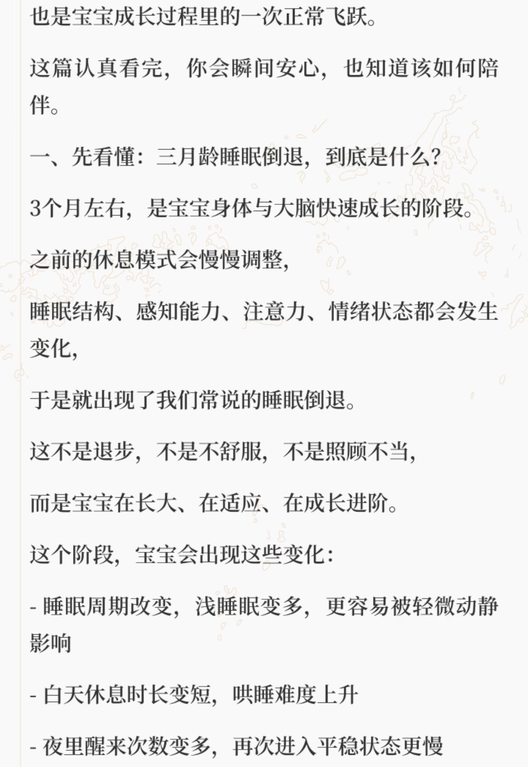 睡眠倒退期一般会持续两到六周,等宝宝的大脑和身体适应了新的节奏,睡眠就会慢慢回到正轨。这段时间确实很熬人,妈妈会觉得很累很疲惫,但这也是宝宝成长路上必经的一小段路。等熬过去了,你会发现宝宝又学会了新本领,比之前更可爱了。
