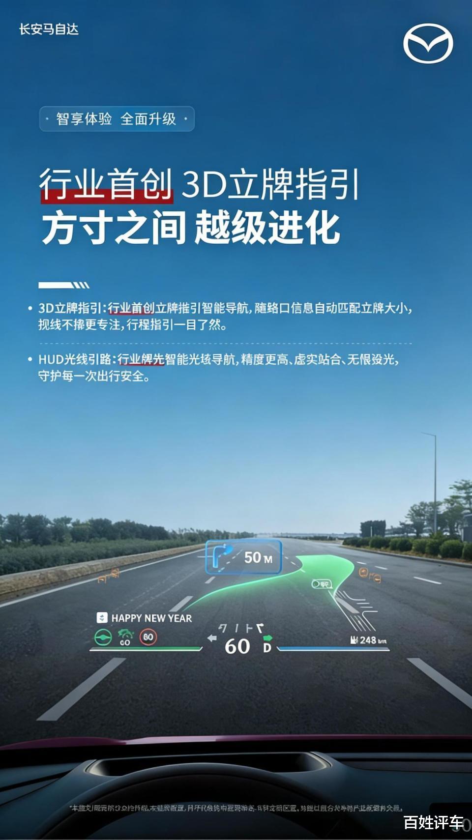 首先是马自达EZ-60搭载了同级唯一的100英寸裸眼3D-HUD,实现了行业首创3D立牌指引智能导航、HUD光毯引路双创新。对比有些车型的基础W-HUD(仅显示车速等简易信息)或2D平面AR-HUD,在以上复杂场景下,驾驶者从‘平面图到立体空间’还需要脑补一下,而马自达EZ-60直接将这种脑补工作视觉化、直觉化,这种体验构成了对竞品的代差优势。