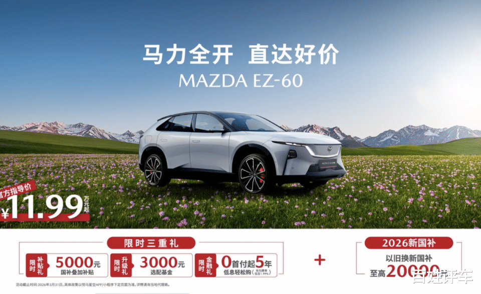 即日起至2026年3月31日,购买马自达EZ-60,在至高20000元以旧换新国补基础上,可同步享受三重新春限时购车礼遇:
