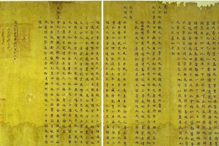 2013年,辽宁博物馆的《康熙皇帝遗诏》曾公开亮相,让我们有幸一睹真容。只见它长150厘米,宽80厘米,由金色的绢布书写,总字数多达1700多字。大段文字在歌颂康熙皇帝的丰功伟绩,仅最后一小部分指明传位事宜。