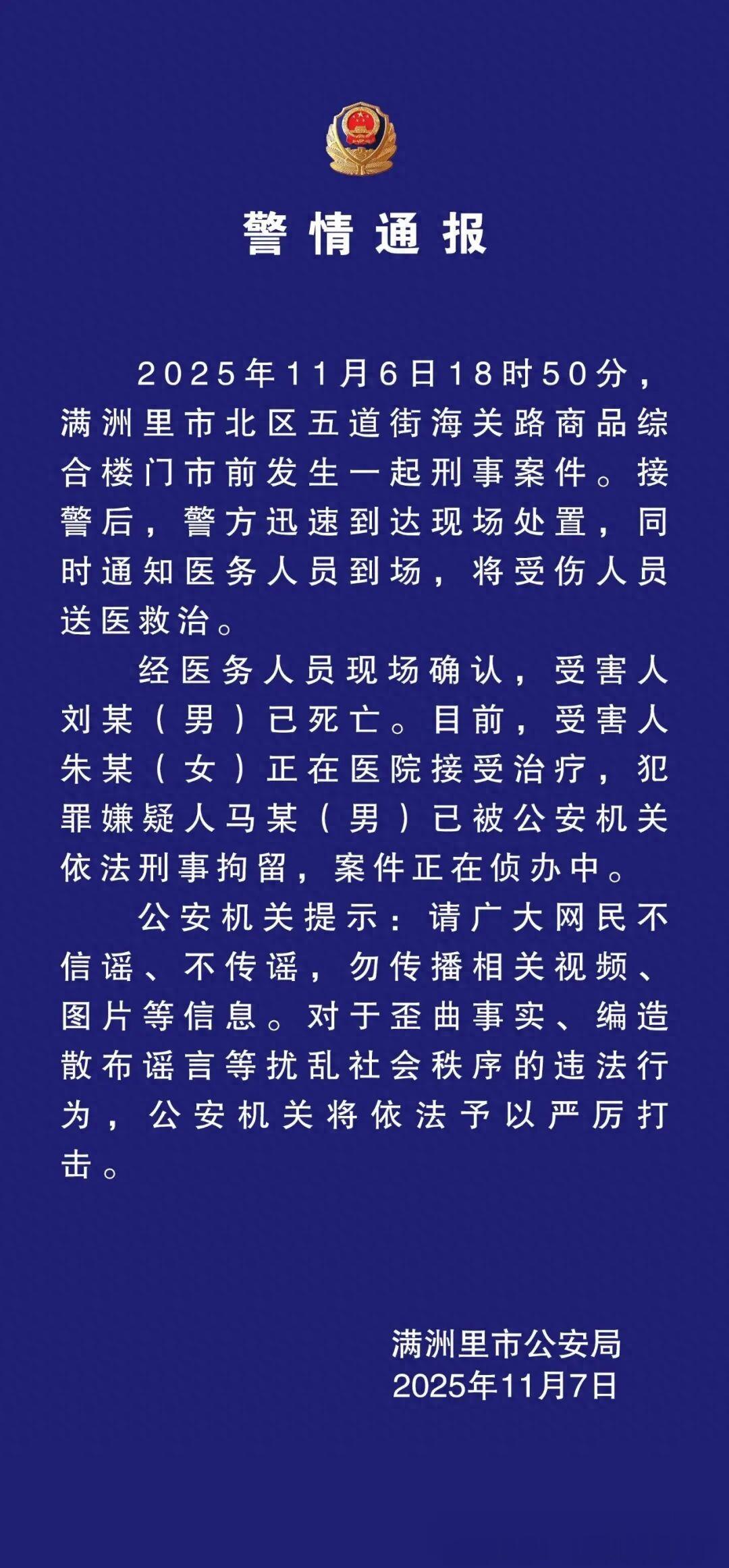 11月7日,满洲里市公安局发布情况通报: 2025年11月6日18时50分,满洲里市北区五道街海关路商品综接合楼门市前发