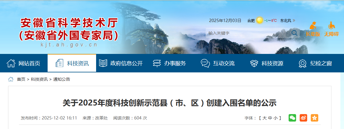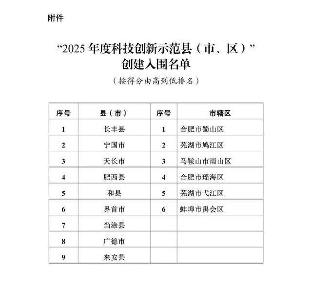 根据《安徽省科技创新示范县(市、区)创建工作方案(试行)》(省科技办秘〔2025〕18号)和《关于开展〈2025年度安徽省科技创新示范县(市、区)创建工作〉的通知》相关要求,经对各市报送的数据复核比对、分值计算排序和会议研究审定等程序,现将“2025年度科技创新示范县(市、区)”创建入围名单予以公示。