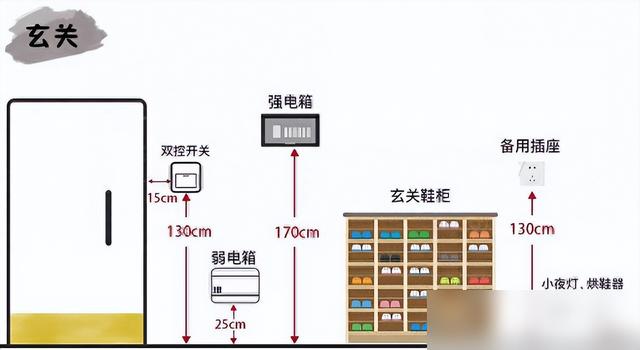 根据一级电工的布局铁律,玄关至少需要1个五孔插座(鞋柜旁,方便烘鞋器或手机临时充电)+1个开关(控制玄关灯)。