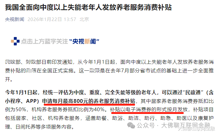 简单来说,这个措施就是上面出钱,给符合条件的失能老人分担一部分养老服务的花费,减轻养老压力,只不过这个补贴不像育儿补贴那样直接发钱,而是以电子消费券的形式发放。
