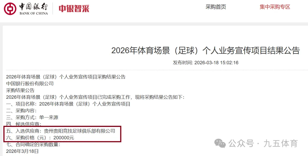 能够有赞助商青睐,钱多钱少都算是对球队的一种支持。日前,中国银行发布了“2026年体育场景(足球)个人业务宣传项目采购结果公告”,采购金额为20万元,入选供应商是贵州贵阳竞技足球俱乐部。