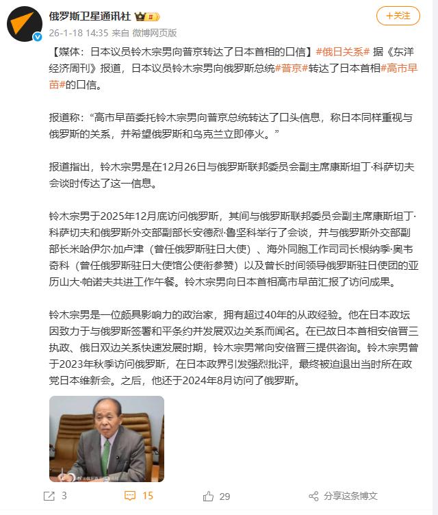 于是,高市早苗特意派了自民党参议员铃木宗男去莫斯科,给普京带了句看似中立的话:“日本也非常重视与俄罗斯的关系,希望俄罗斯和乌克兰能立即停火。”