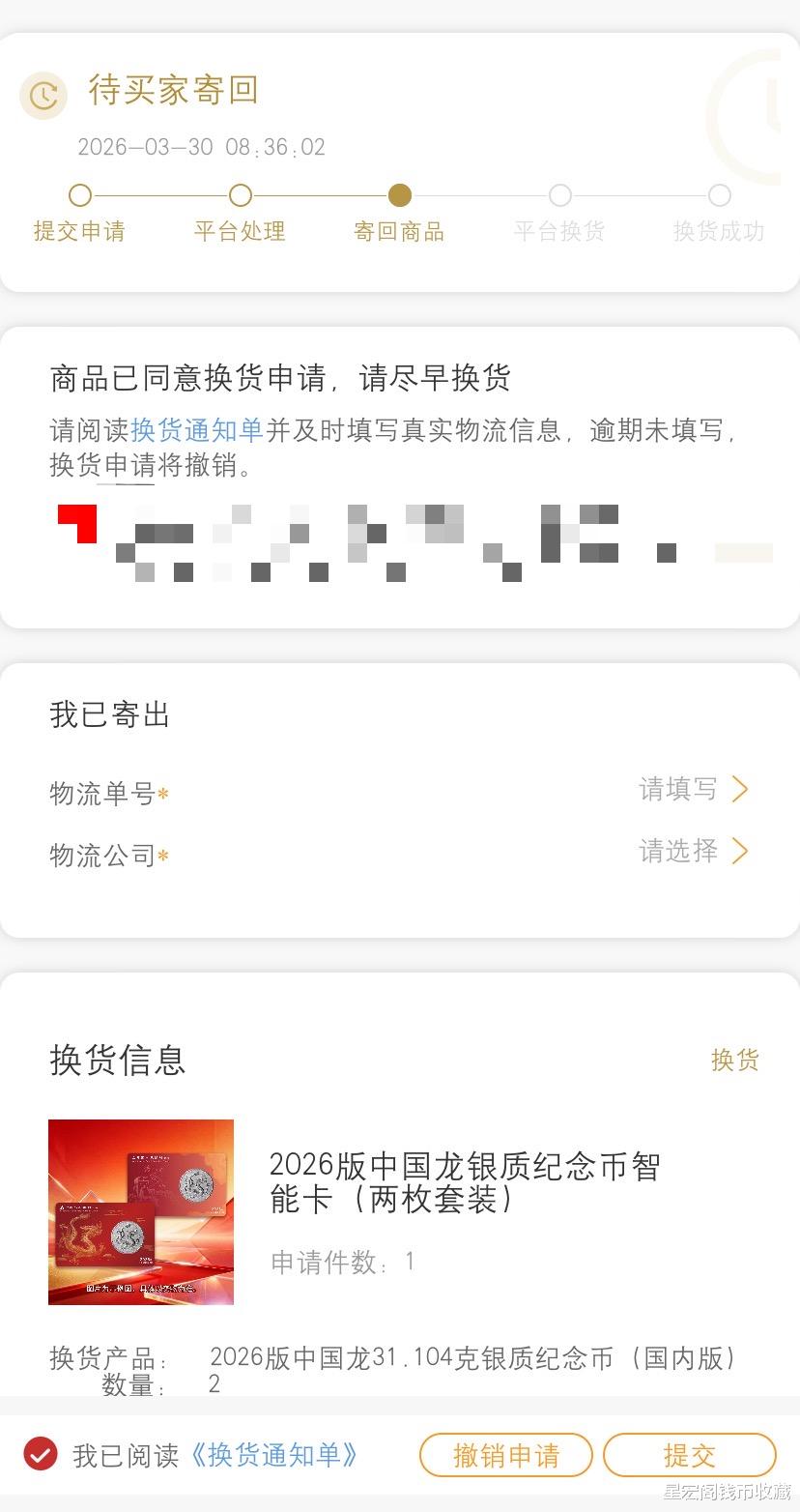 金币云商中签的2026版中国龙银币智能卡,在上周我也收到了货,但是发现有质量问题,于是在上周也进行了申请换货。上周五我就看到已经有工单上报申请换货,今天申请换货的2026版中国龙银币智能卡换货申请也已经通过,已经把申请换货的2026版中国龙银币智能卡发出。