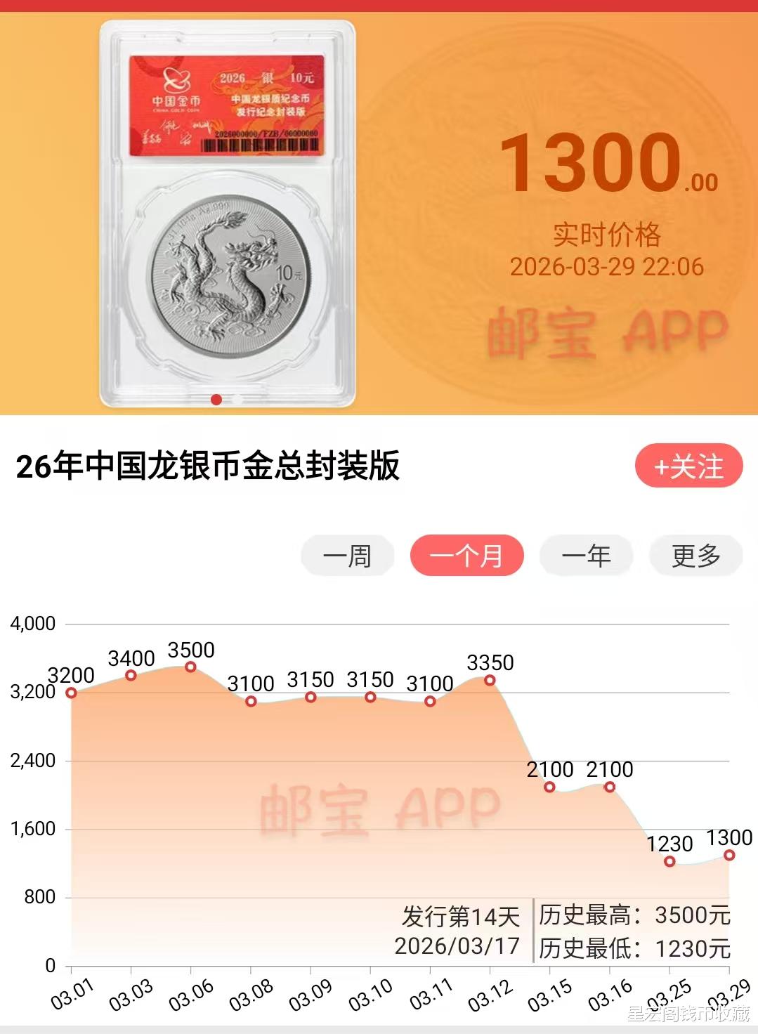 2026版中国龙银币封装纪念版市场行情也迎来了小幅反弹,今天看到证书号码带4的2026版中国龙银币封装纪念版市场行情已经回升到1300~1400元左右,对比上周也是有明显的上涨。