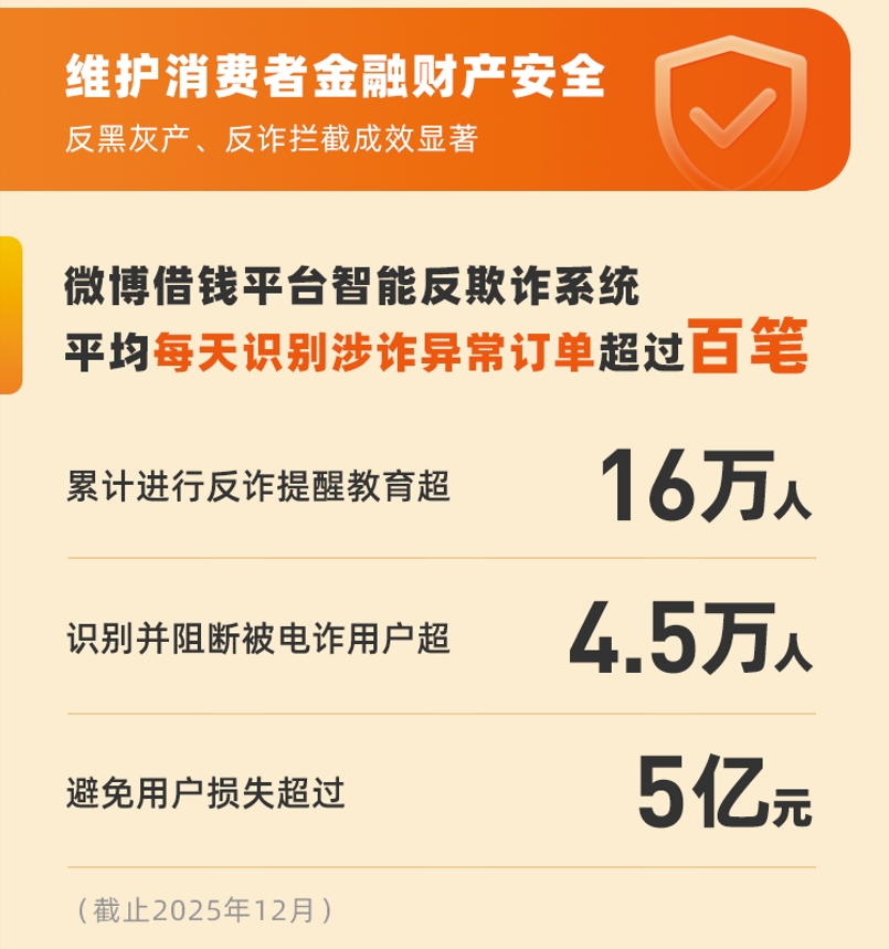 在维护消费者金融财产安全方面,微博借钱平台智能反欺诈系统表现突出。系统平均每天识别涉诈异常订单超百笔,全年累计进行反诈提醒教育超16万人,成功识别并阻断被电诈用户超4.5万人,避免用户潜在经济损失超过5亿元。