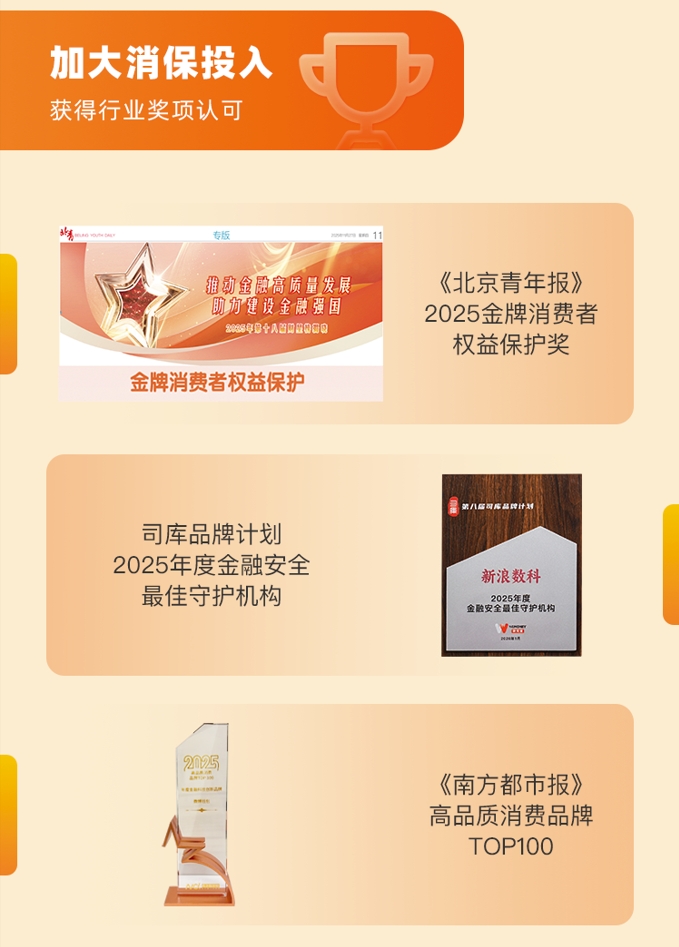在平台数字安全建设方面,新浪数科持续推进数据治理与信息安全体系建设,年内获得数据治理能力成熟度(DCMM)国家二级认证,并通过ISO27001信息安全管理体系与ISO27701隐私信息管理体系国际标准认证,进一步夯实平台安全根基。同时,平台成功获得《北京青年报》“2025金牌消费者权益保护奖”、司库品牌计划“2025年度金融安全最佳守护机构”、《南方都市报》“高品质消费品牌TOP100”等多个奖项认可。