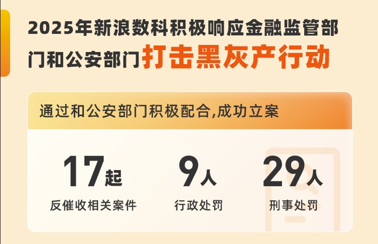 2025年,新浪数科积极响应金融监管部门与公安部门号召,深度参与打击黑灰产专项行动。通过与公安部门紧密配合,成功立案反催收相关案件17起,协助行政处罚9人、刑事处罚29人,对黑灰产不法分子和机构形成有力震慑。