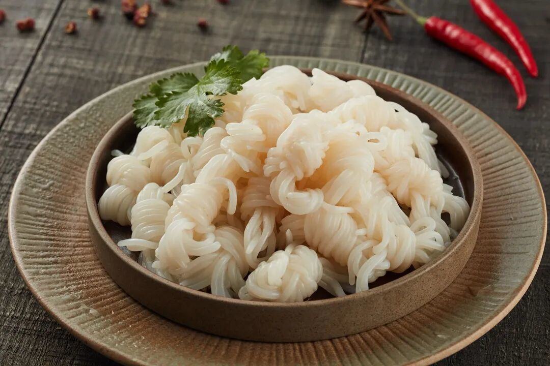 在餐饮店里,用魔芋做的主食不胜枚举,包括魔芋粉、魔芋面、魔芋凉皮、魔芋饺子等等。因为魔芋富含葡甘聚糖(一种可溶性膳食纤维,吸水后能大幅膨胀),该物质不易消化,能产生明显饱腹感,且热量低,故而魔芋也是轻食店常用的食材。