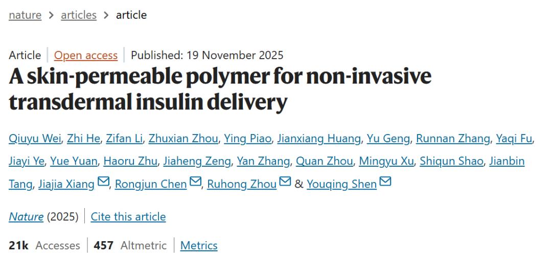 11月19日,国际顶级学术期刊《自然》(Nature)在线发表了一项来自浙江大学等团队的重要研究成果,题为A skin-permeable polymer for non-invasive transdermal insulin delivery(一种用于无创透皮胰岛素递送的皮肤可渗透聚合物)。该研究首次报道了一种皮肤渗透性高分子——OP,成功实现胰岛素无创透皮给药,其胰岛素键合物(OP-I)在糖尿病动物模型中,展现出与皮下注射胰岛素相当的降糖疗效。论文通讯作者为浙江大学申有青教授、周如鸿教授,相佳佳研究员以及英国帝国理工学院陈荣军教授。