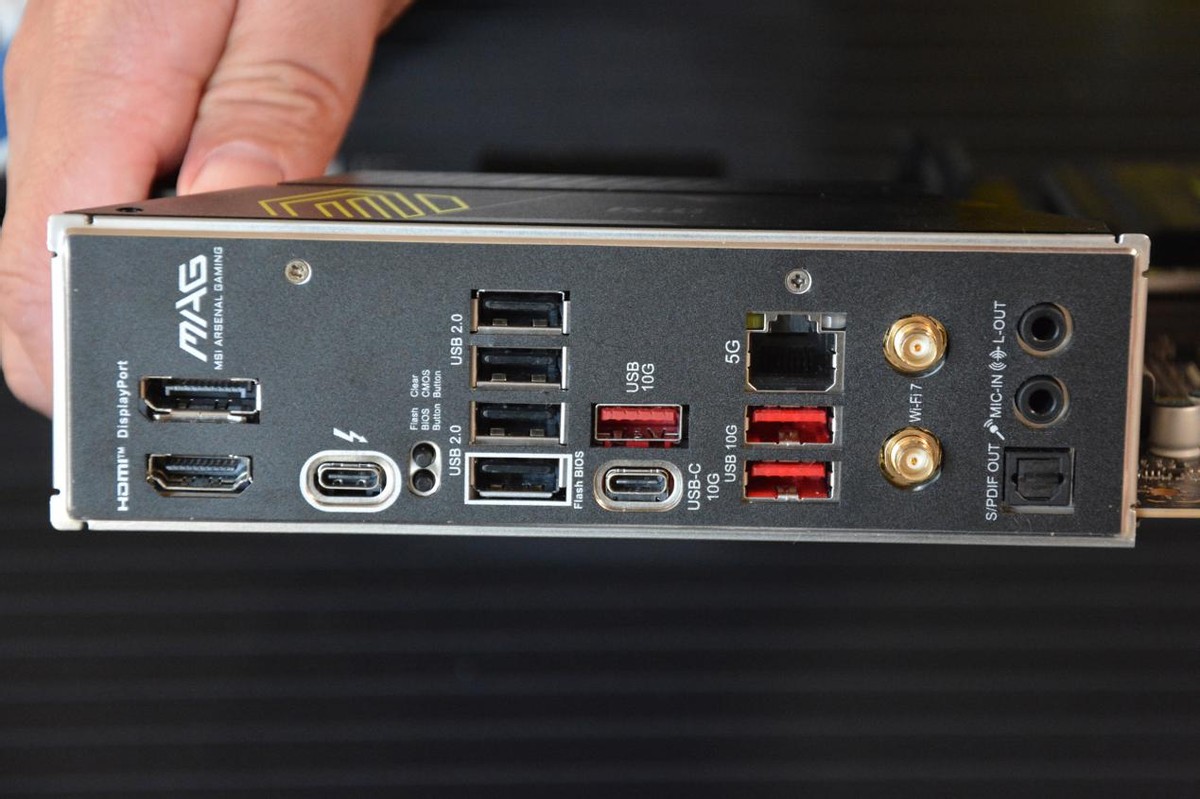 微星MAG B860M MORTAR WIFI主板的I/O区域,从上到下依次为HDMI接口、DP接口、雷电4接口、4个USB 2.0接口、3 个 USB-A接口、1Type-C接口、5Gbps LAN (RJ45)接口、Wi-Fi 天线接口以及音频插孔与光纤 S/PDIF 输出接口。